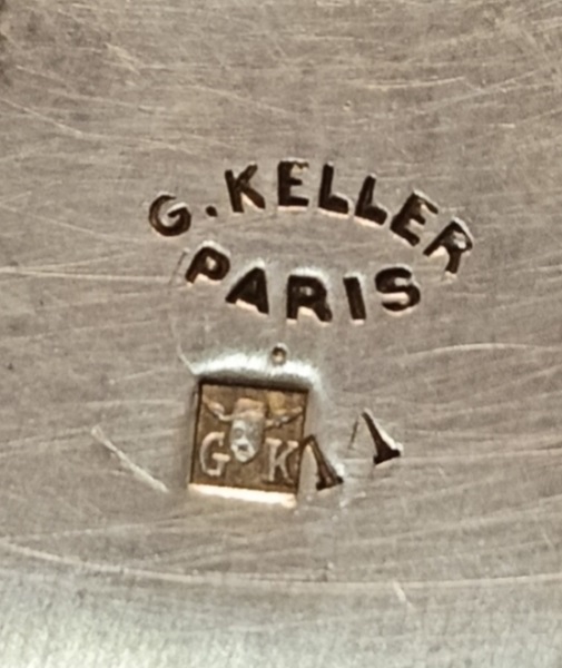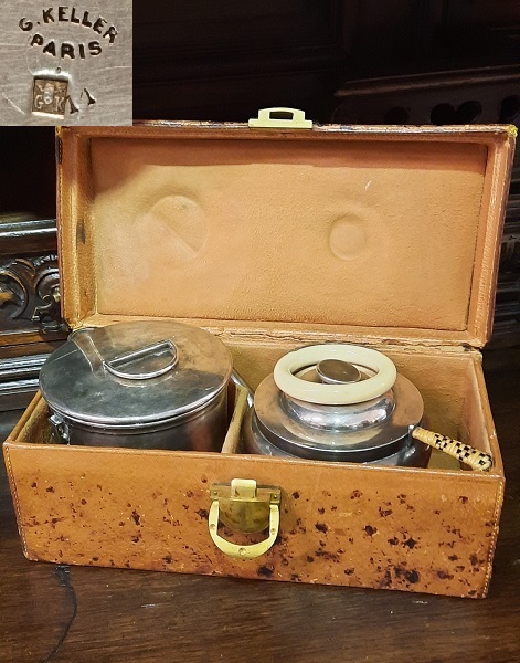 Французский дорожный чайный сервиз из позолоченного серебра Густава Келлера (GUSTAVE KELLER), около 1900 года. Изготовлен набор из серебра 950 пробы, сЪемная кольцевидная ручка из кости, а ручка чайника оплетена тростником. Оригинальный футляр с печатью фирмы. С 1897 года Gustave Keller стал поставщиком императорского российского двора и Николай II лично принимал участие при выборе его изделий. ЛЕГЕНДА : бывшие владельцы сообщают, что предмет принадлежал племяннику( ? ) Николая II , подарок который не был подарен. Бытовал на Фонтанке.
