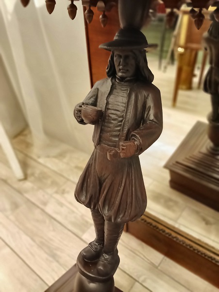Поставьте вазу, бюст или кашпо на этот элегантный антикварный столик, изготовленный в Бретани, Франция, около 1870 года, стоит на широком квадратном основании. Ножками являются резная скульптура бретонца в традиционной одежде и курящего трубку и парой женщина бретонка с кувшином в руке. Поверхность покрыта большой квадратной столешницей с цветочными мотивами и украшена навершиями по краям. Подставки в отличном состоянии, соответствующем возрасту и использованию, и украшена резьбой, включая детали лица и одежды.