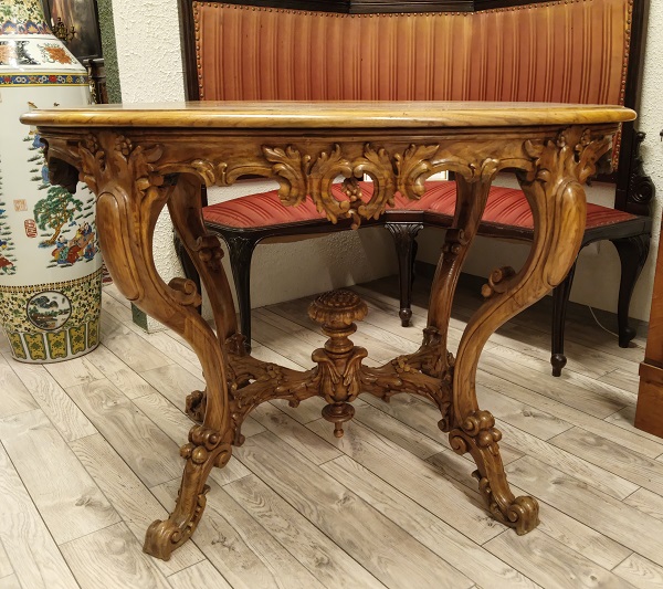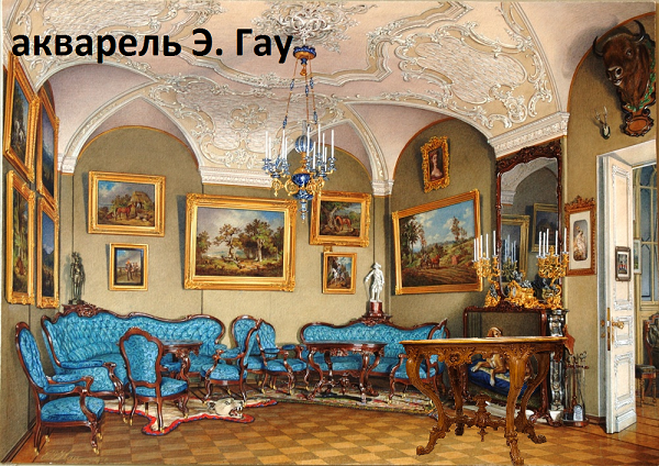 Стол Александра ll с акварели Э.Гау. Гостиная в арсенальном каре 1874 г. Гатчинского Дворца была обставлена ореховой мебелью в стиле «второго рококо» мастерской А. Тура в 1851 году. . см.(акварель Э. Гау, фотография 1938 года).
