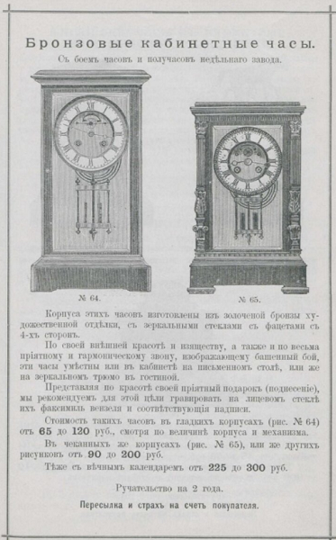 Можно сейчас купить на мешке: https://meshok.net/item/346515313 Часы кабинетные бронзовые с ртутным маятником фирмы Павел Буре. Имеют часовой и получасовой бой. Бронзовый корпус, граненое стекло с фацетом , ключ есть. Надпись "PAUL BUHRE ST PETERSBOURG №5440" Внимание !!! есть недостаток : стекло боковое правое в нижнем углу чуть повреждено по фацету см.фото----------------------------- "Корпуса этих часовъ изготовлены изъ золоченой бронзы ху- дожественной отдѣлки, съ зеркальными стеклами съ фацетами съ 4-х сторонь. По своей внѣшней красотѣ и изяществу, а также и по весьма пріятному и гармоническому звону, изображающему башенный бой, эти часы умѣстны или въ кабинетѣ на письменномъ столѣ, или же на зеркальномъ трюмо въ гостиной. Представляя по красотѣ своей пріятный подарок (поднесеніе), Мы рекомендуем для этой цѣли гравировать на лицевомъ стекл ихъ факсимиль вензеля и соотвѣтствующія надписи. Стоимость таких часовъ въ гладкихъ корпусах (рис. № 64) от 65 до 120 руб., смотря по величинѣ корпуса и механизма. Въ чеканныхъ же корпусахъ (рис. № 65), или же других рисунковъ отъ 90 до 200 руб. Тѣже съ вѣчнымъ календаремъ отъ 225 до 300 руб. Ручательство на 2 года. Пересылка и страхъ на счеть покупателя. "