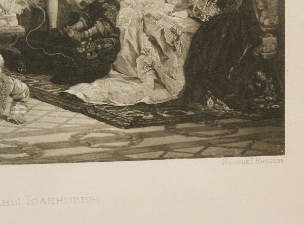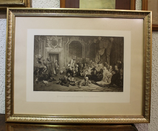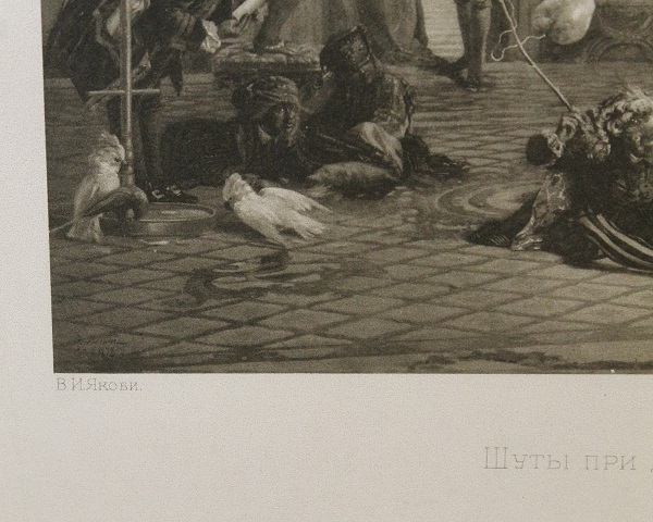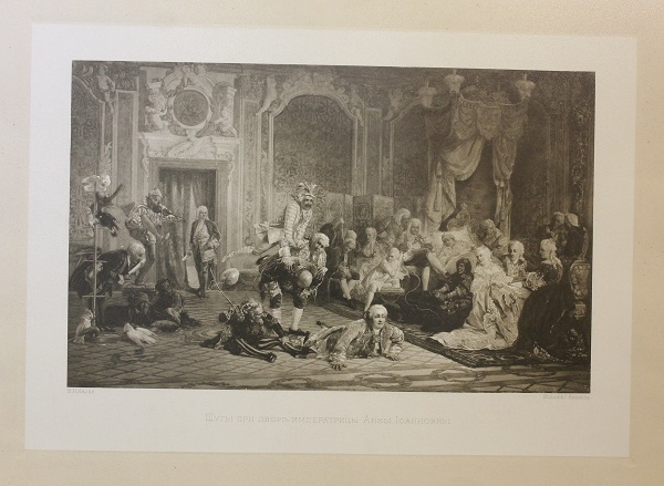 Большая гелиогравюра с картины известного русского художника, члена академического Совета Императорской Академии художеств Валерия Ивановича Якоби (1834–1902) «Шуты при дворе императрицы Анны Иоанновны». Гравюра входила с состав большого подарочного альбома «Московская городская художественная галерея П.и С.Третьяковых», издававшегося в 1902-1903 гг. известным российским меценатом и книгоиздателем Иосифом Кнебелем и отпечатанного в типографии Ф.А.Брокгауза в Лейпциге. Любимый шут императрицы - Пьетро-Мира Педрилло (Pedrillo) слева, играет на скрипке. Гравюра оформлена в раму и закрыта антибликовым стеклом.
