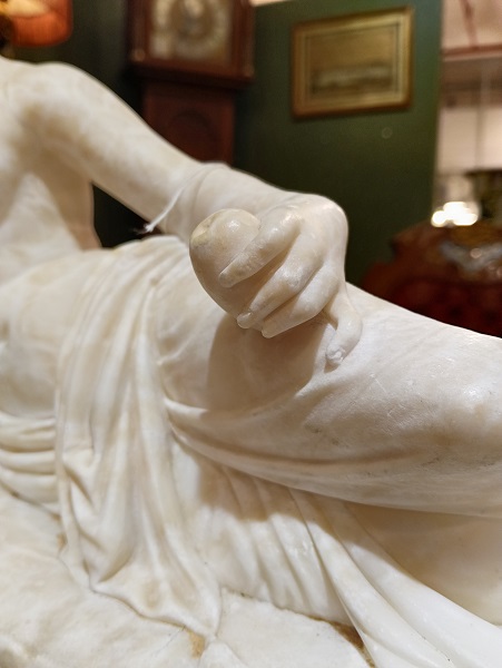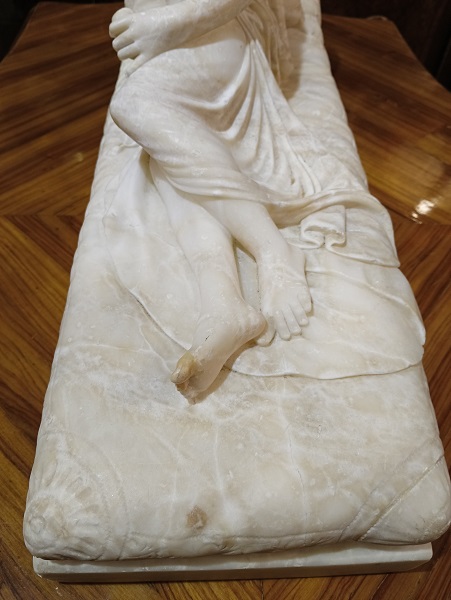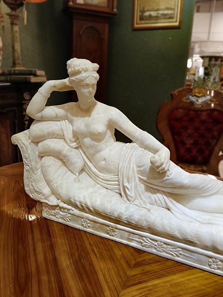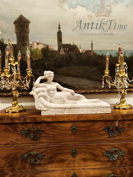 Большая, старинная, алебастровая скульптура сделанная после Антонио Кановы. «Венера Победительница» автор Antonio Canova (1757-1822, Italian) , изображает Полин Боргезе, младшую сестру Наполеона, в виде обнаженной красавицы, лежащей на мраморном ложе в виде Венеры-победительницы с яблоком в левой руке. Бытовала в СПБ. Выполнена из кремового мрамора(алебастр) с характерными для материала насыщенными светло коричневыми тонами. Алебастр светится на просвет см.фото 2. Имеет старые реставрационные следы. Видео по запросу.