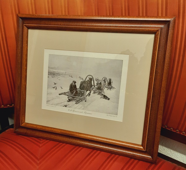 Литография в деревянной раме И.М Прянишников "Порожняки" , «Товарищество «Бр. А. и И. Гранат и Ко»» — российское издательство, основанное в 1892 г. братьями Гранатами, Александром Наумовичем и Игнатием Наумовичем. После Октябрьской революции 1917 года быстро утратило самостоятельность (в конфискованном у издательства здании затем разместился Литературный институт). Работы издателя Т-во «Бр. А. и И. Гранат и Ко» находятся в музеях России -------------------------------- Исполнено по картине Иллариона Михайловича Прянишникова (Illarion Mikhailovich Pryanishnikov), написанной в 1871 году, была тепло принята современниками художника. Бесхитростный сюжет взят из жизни: крестьяне отвезли свои товары в город и возвращаются по зимнику в родную деревню. Костлявые лошадёнки бегут знакомым путём. Оживляет действие лохматая собака, увлечённо нырнувшая носом в снег. По другую сторону от вереницы саней резвятся многочисленные вороны.