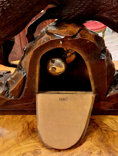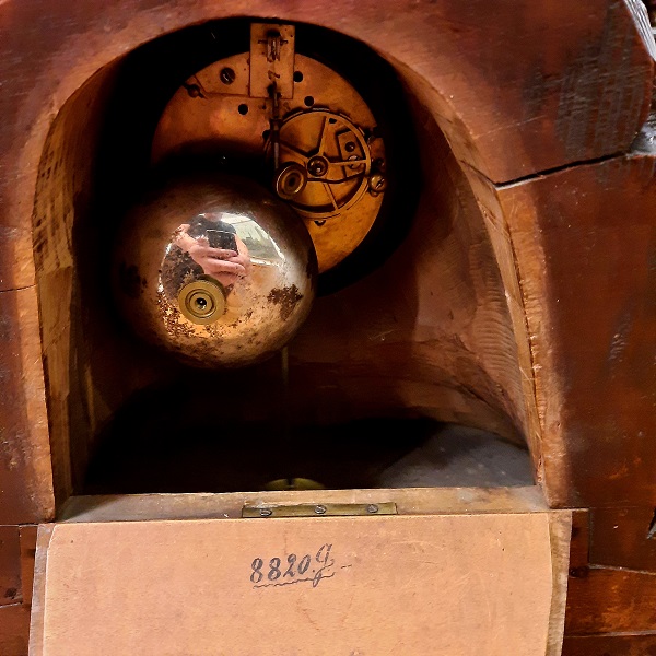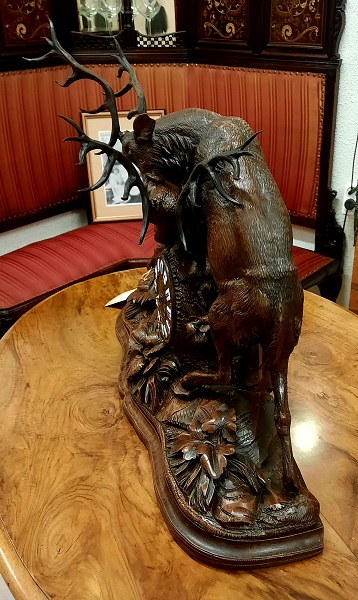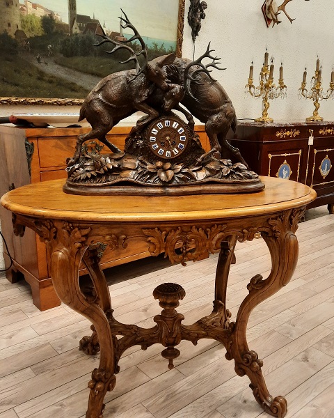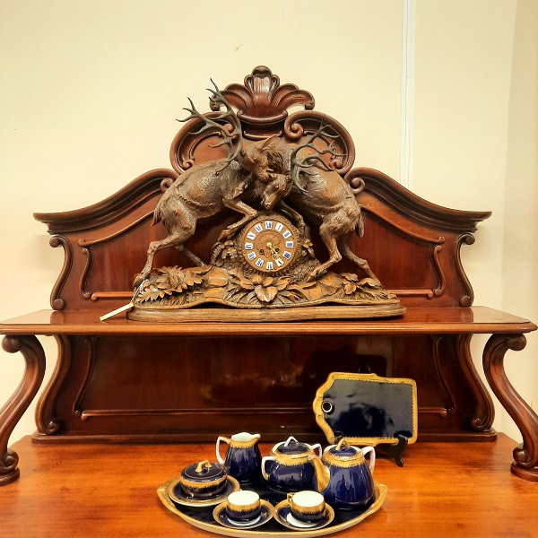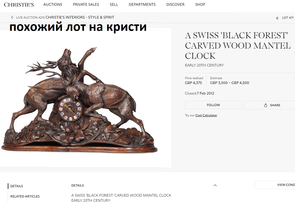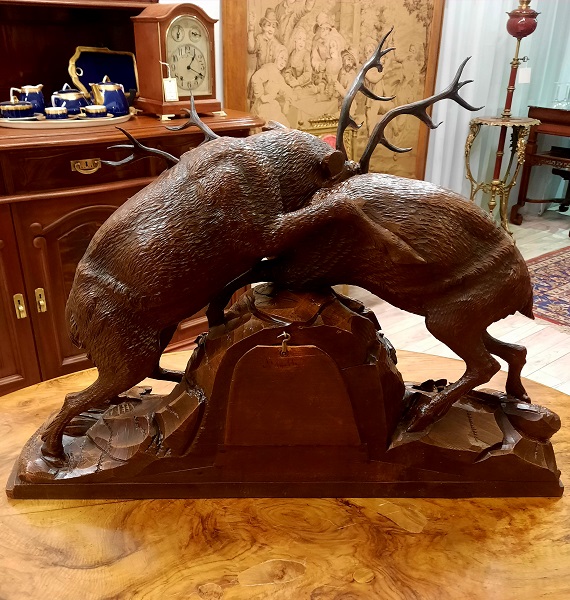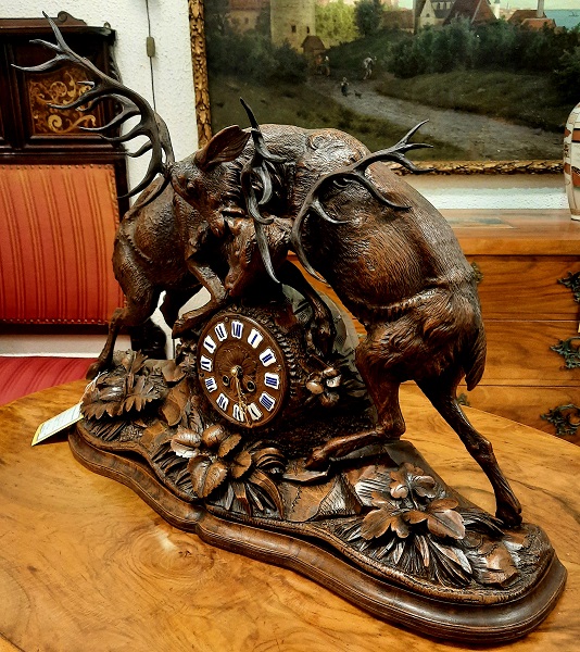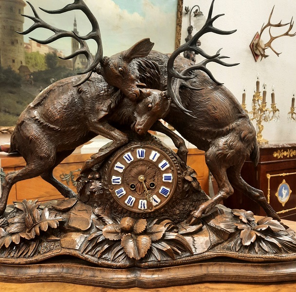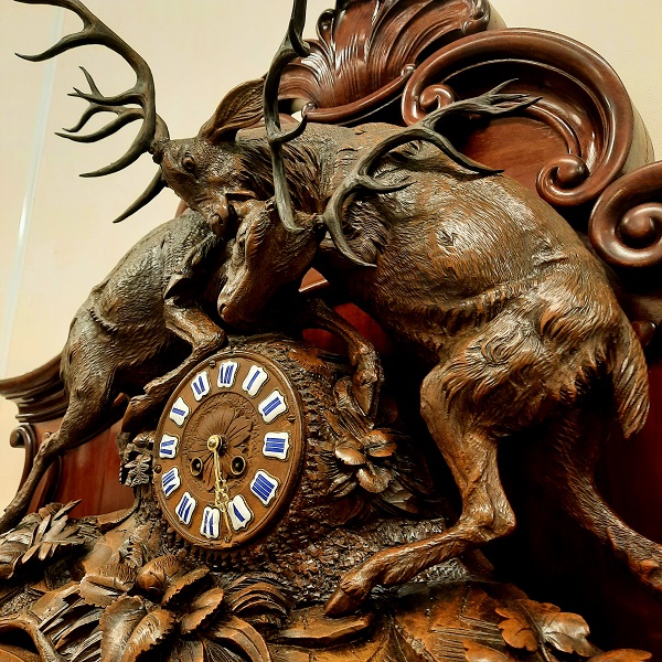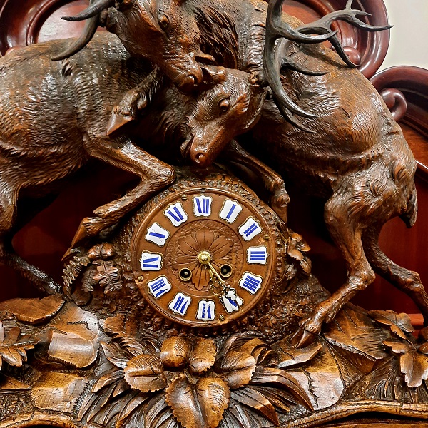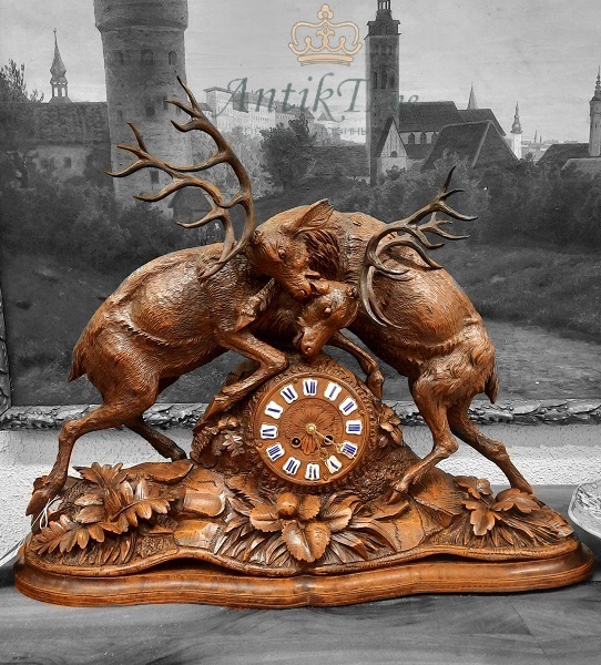 Старинные часы из Шварцвaльда "Black Forest " около 1900 года. Деревянный корпус украшен изображением двух оленей на натуралистичном основании, циферблат с эмалевыми римскими цифрами, механизм с боем. Ключ в комплекте. Ходят, бьют. Клеймо на механизме относит к периоду 1855-1865 год. Клеймо на задней дверце с адресом Neustadt 10. В XIX веке Нойштадт (часть современного Титизее-Нойштадта) был важным центром часового дела Шварцвальда, особенно известным часами Winterhalder & Hofmeier и часами «Sorg» или «Jockele». Этот регион считался колыбелью часовой традиции Шварцвальда. Пережили блокаду, бытовали в Санкт-Петербурге, в Петроградском районе.