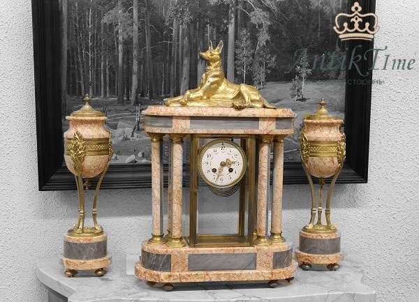 Старинные часы из мрамора и бронзы с навершием в виде лежащей собаки. Комплект из 3-х предметов. Размер часы: Н56х16Х38 см. Есть бой. маятник и ключ есть.