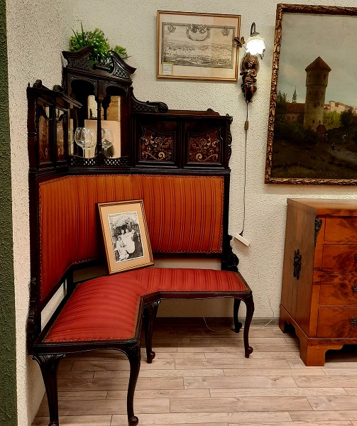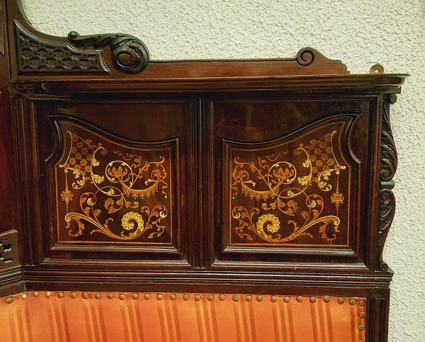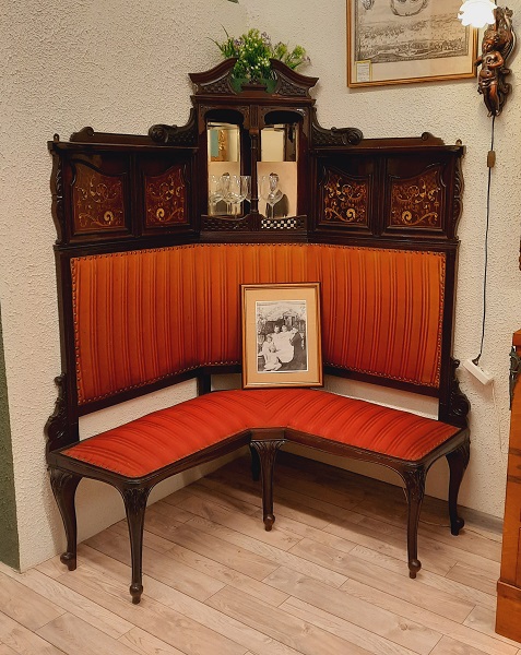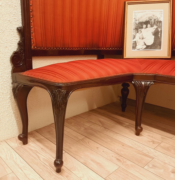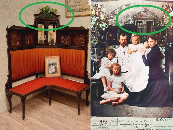 Ореховый диван 19-20 века. Поставщик Двора Его Императорского Величества фабрика Ф. Мельцера. Украсит любой музей, выставку,подойдёт для частной коллекции, для общества любителей Романовых.______________________________ _________"Для комнаты великой княжны Ольги Николаевны был создан угловой диван с высокой спинкой и барочным фронтоном, украшенный декоративными композициями со вставками модного целлулоида, который представлял собой серийную продукцию высокого качества. Ножки-кабриоли и рельефная трельяжная сетка с цветочками на венчающем фронтоне в дальнейшем станут характерными чертами мебели модерна." _______Справка : такой угловой диван стоял на Нижней даче императора Николая II в Петергофе . Где 30 июля 1904 года родился единственный сын Николая II и Александры Алексей. Здесь же императором был подписан манифест о вступлении России в Первую мировую войну.____________ _____В 1885 году Александр III распоряжается о строительстве "Нижней дачи" по проекту архитектора Антония Томишко.